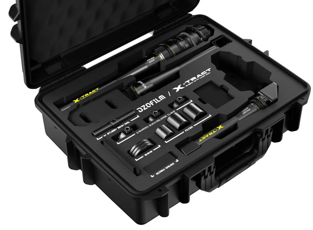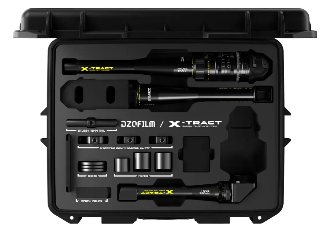 Комплект макрообъективов DZOFilm X-Tract 18–28mm T8 FF Probe Zoom ARRI PL с углом обзора от 100 до 73° предлагает инновационные возможности для съемки крупным планом. Длина объектива составляет всего 41,5 см, а диаметр передней части — около 3 см, что делает его идеальным для работы в ограниченном пространстве. Он оснащен относительно быстрой максимальной диафрагмой T8, максимальным увеличением 2,1:1 и минимальным фокусным расстоянием 6 мм.