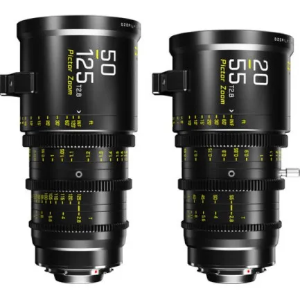 Этот комплект объективов Pictor 20-55mm и 50-125mm T2.8 от DZOFilm состоит из двух объективов с обычной черной отделкой. Объективы обеспечивают покрытие расширенного зум-диапазона с относительно быстрой максимальной диафрагмой. Оба объектива подходят для сенсоров Super35 и имеют схожие размеры, вес, положения зубчатых колец и наружный диаметр передней части, что облегчает быструю смену объективов.