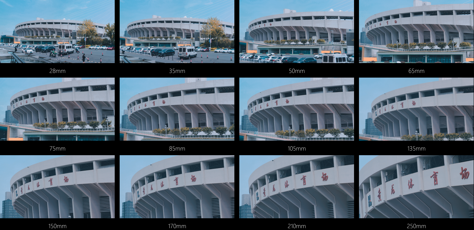 Объектив с фокусным расстоянием 75–250 мм имеет оптический круг 46 мм, полностью покрывающий полнокадровый сенсор. При установке на камеру с сенсором Super35 угол обзора становится уже, обеспечивая более приближённое изображение.