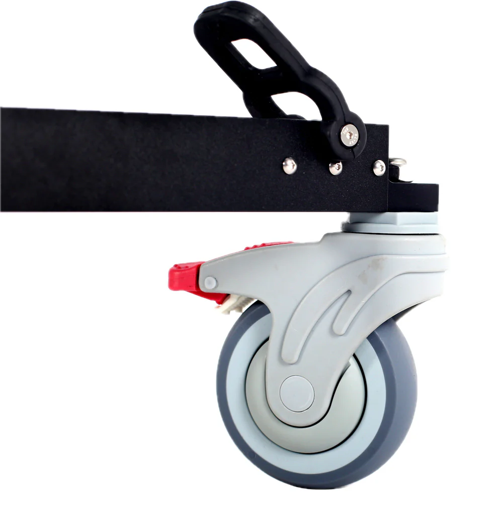 Регулируемые зажимы надёжно удерживают ножки штативов разных диаметров без люфтов. Достаточно подогнать зажим под размер опоры и защёлкнуть фиксатор, штатив плотно садится в посадочные места, исключая смещение при движении. Каждое колесо оснащено педальным блокиратором: лёгкое нажатие ногой мгновенно фиксирует положение тележки. Для возобновления движения достаточно отпустить педаль, переход между режимами происходит без задержек и дополнительных манипуляций.