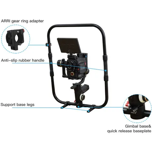 Широкая зона захвата GIMBAL MAGIC RING I увеличивает центр тяжести, а также обеспечивает зону захвата для передачи функций оператору при съемке, которая в противном случае была бы невозможна. Входящие в комплект опорные ножки основания позволяют устанавливать кольцо с карданным шарниром на плоской поверхности, когда оно не используется.