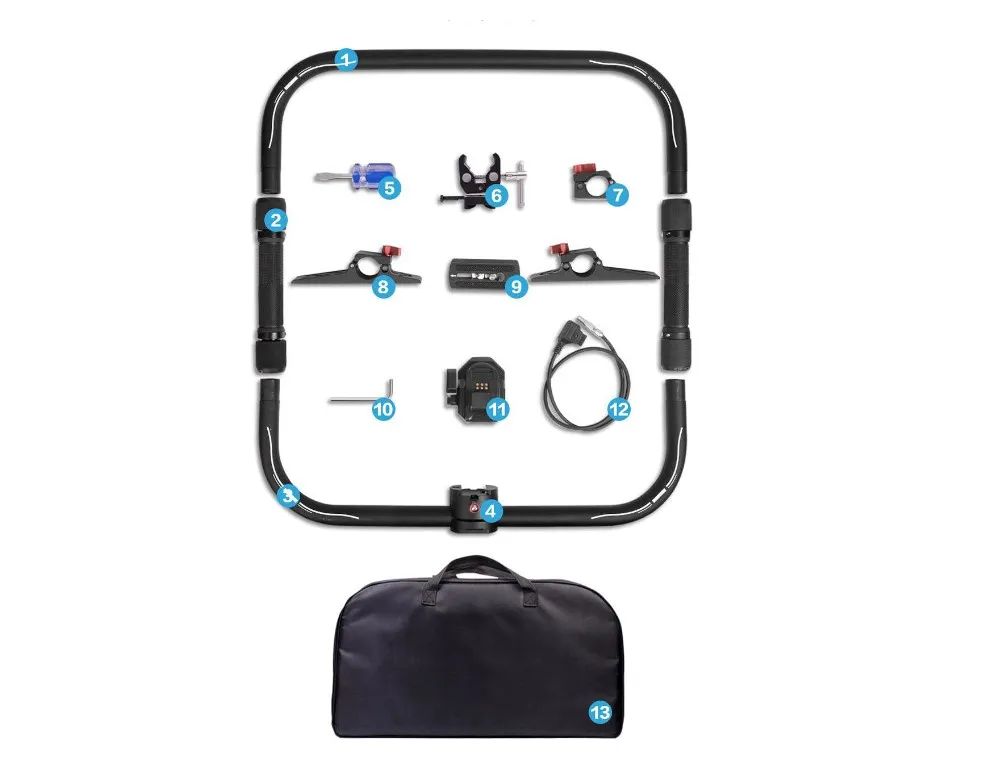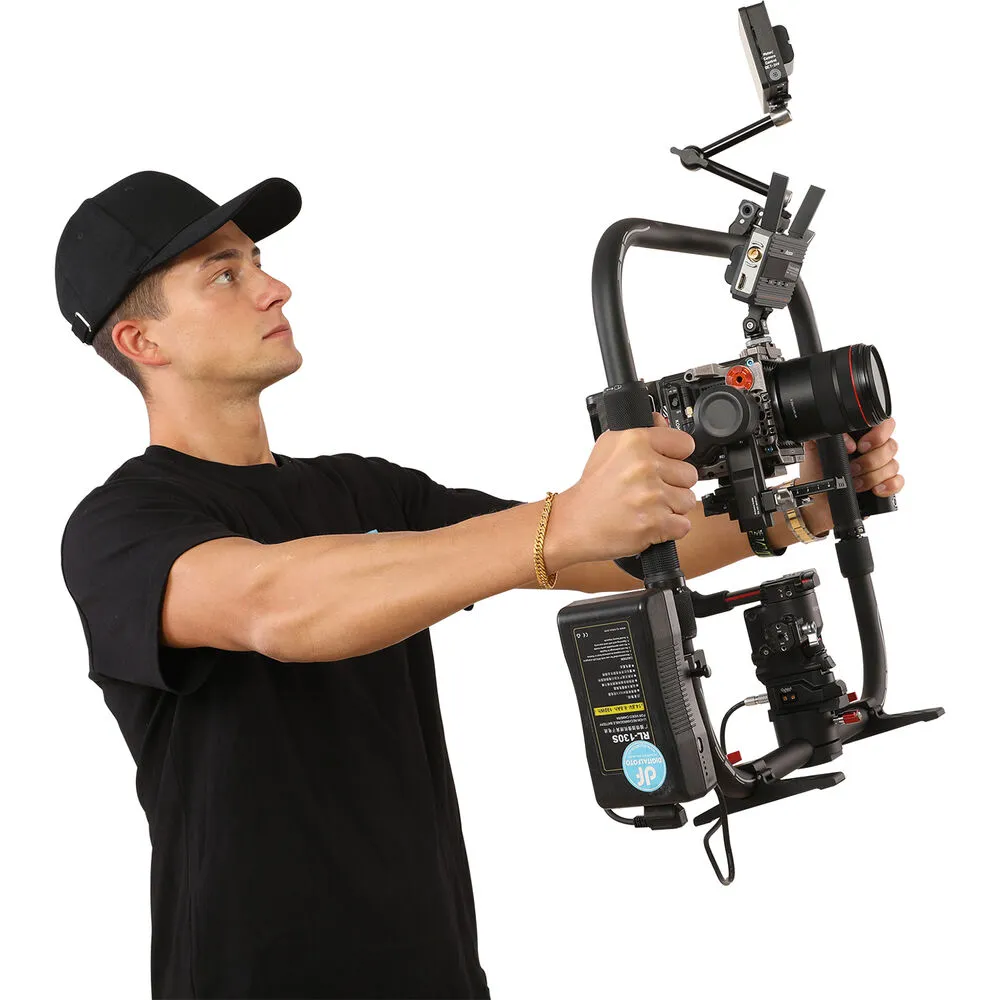 Лёгкая алюминиевая конструкция сочетает прочность и мобильность. Две резиновые рукоятки обеспечивают надёжный хват двумя руками, минимизируя дрожание камеры даже при длительных съёмках. Съёмные опорные ножки позволяют временно фиксировать конструкцию на горизонтальной поверхности между дублями, сохраняя оборудование в готовности к работе. Крепления стандарта Arri Rosette упрощают интеграцию со студийными осветителями, мэджик арм и другим оборудованием. Мягкий чехол в комплекте защищает компоненты от повреждений при транспортировке.