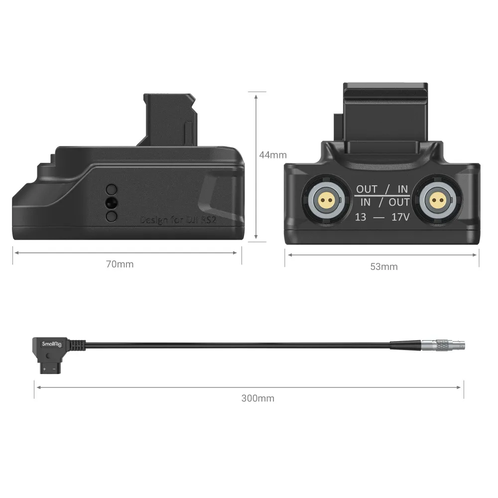 - Питание через D-tap: Адаптерный кабель, входящий в комплект, позволяет подключить батарею D-tap для питания DJI RS 2/RS 3 Pro через порт OB302. Это удобное решение для продолжительных съемок на месте.