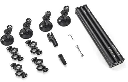 Для фиксации направляющих к кузову автомобиля используются четыре регулируемых зажима из нержавеющей стали и алюминия. Дополнительно в комплект входят четыре вакуумные присоски с прорезиненным основанием, каждая выдерживает нагрузку до 50 кг. Комбинация зажимов и присосок обеспечивает стабильность даже при съёмке на высокой скорости.