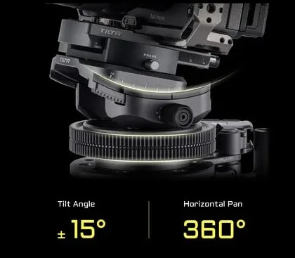 Центральный элемент системы — поворотная голова с зубчатой передачей 0,8 MOD, совместимой со стандартными моторами управления (включая моторы Tilta и сторонних производителей). Это позволяет подключать дистанционный контроллер и выполнять плавные панорамирования в реальном времени — от медленных проходов до динамичных разворотов. Все движение передаётся без люфтов благодаря прецизионной механике.Ось наклона регулируется в диапазоне ±15°, что даёт возможность точно выравнивать горизонт или задавать нужный ракурс без перенастройки всей установки. Регулировка фиксируется надёжно, исключая самопроизвольное смещение даже при вибрации на скорости.