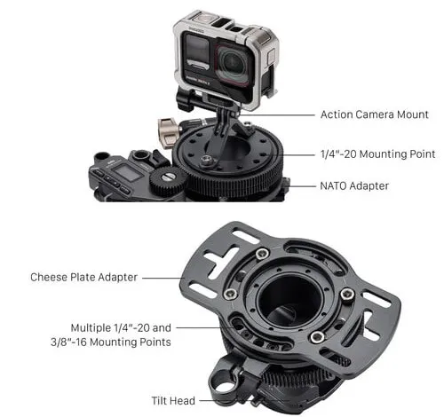 Верхняя часть головы оснащена быстросъёмной площадкой Manfrotto/Arca, что позволяет за секунды установить камеру с клеткой или снять её для съёмки в студии. Нижняя часть включает NATO-планки и 15-мм направляющую длиной 2 дюйма для гибкой интеграции с элементами Hydra x и другими аксессуарами — от удлинителей до демпферов.
