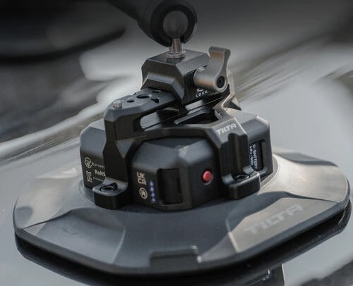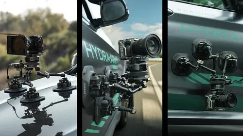 В комплект входят три электронные присоски с вакуумными датчиками и индикацией давления. Каждая присоска оснащена тревожной системой: при падении вакуума подаётся визуальный и звуковой сигнал, что гарантирует безопасность съёмки на скорости. Присоски крепятся через NATO-кронштейны и регулируются под поверхность кузова, обеспечивая устойчивость даже на неровных участках.Верхняя часть головы оснащена быстросъёмной площадкой Manfrotto/Arca, что позволяет за секунды установить камеру с клеткой или снять её для съёмки в студии. Нижняя часть включает NATO-планки и 15-мм направляющую длиной 2 дюйма для гибкой интеграции с элементами Hydra x и другими аксессуарами — от удлинителей до демпферов.