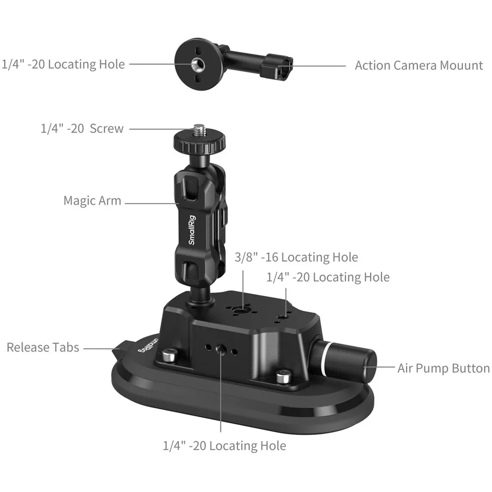 Крепление SmallRig 5842 разработано для безопасной фиксации экшн-камер на автомобиле или в студии. Конструкция объединяет устойчивую базу, гибкий мэджик арм и стандартный узел установки камеры. Это решение обеспечивает стабильную платформу для динамичной съемки в движении или при создании таймлапсов.
