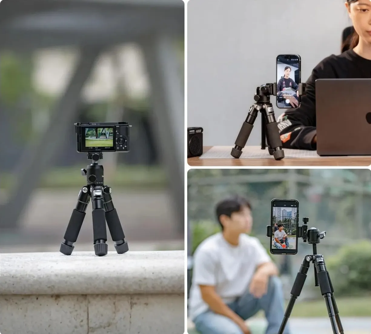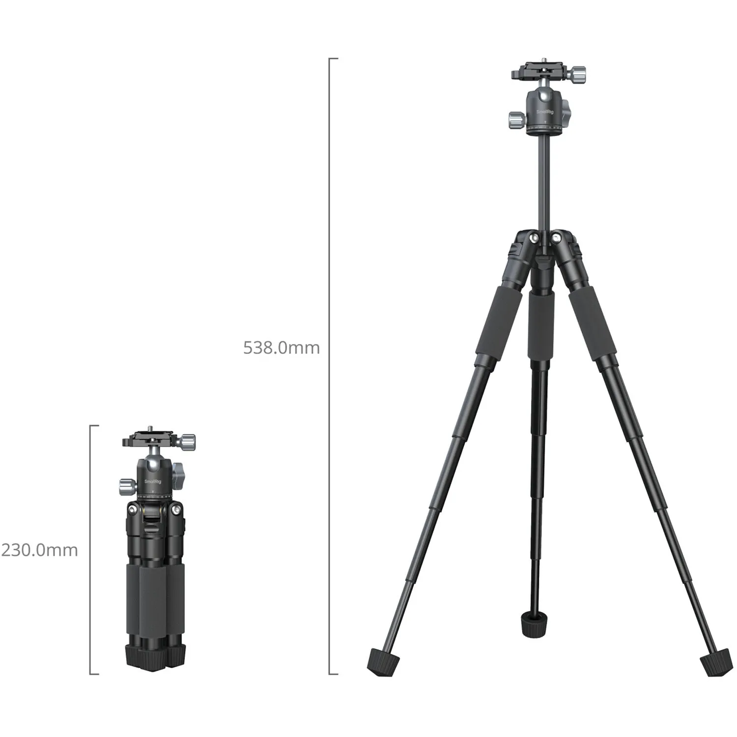 В сложенном виде штатив занимает всего 23 см и весит 635 г, легко помещаясь в рюкзак или сумку. Ножки из алюминиевого сплава выдерживают до 5 кг, а поворотная голова до 3 кг. Высота регулируется за счёт выдвижной центральной колонки и достигает 54 см, что позволяет гибко выбирать ракурс даже на рабочем столе или низкой поверхности. Для фиксации положения ножек и колонки предусмотрены три удобных регулировочных винта, они легко откручиваются и затягиваются вручную, без инструментов.