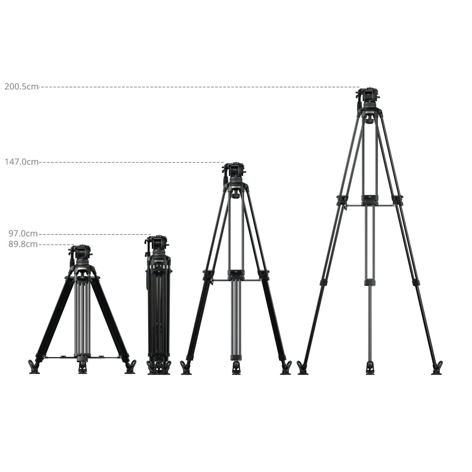 Установка требуемой высоты за одно движение в диапазоне от 89,8 см до 200,5 см. Трёхсекционные алюминиевые ноги фиксируются надёжными винтовыми замками, а срединный распор обеспечивает устойчивость конструкции на любой поверхности. Жидкостная голова с 100-мм посадочной полусферой оснащена независимыми регуляторами демпфирования панорамирования и наклона — по четыре уровня на каждую ось. Диапазон наклона составляет +90° / –60° с отдельными фиксаторами, что позволяет точно контролировать движение камеры. Быстросъёмная площадка упрощает установку и снятие оборудования без перенастройки баланса.