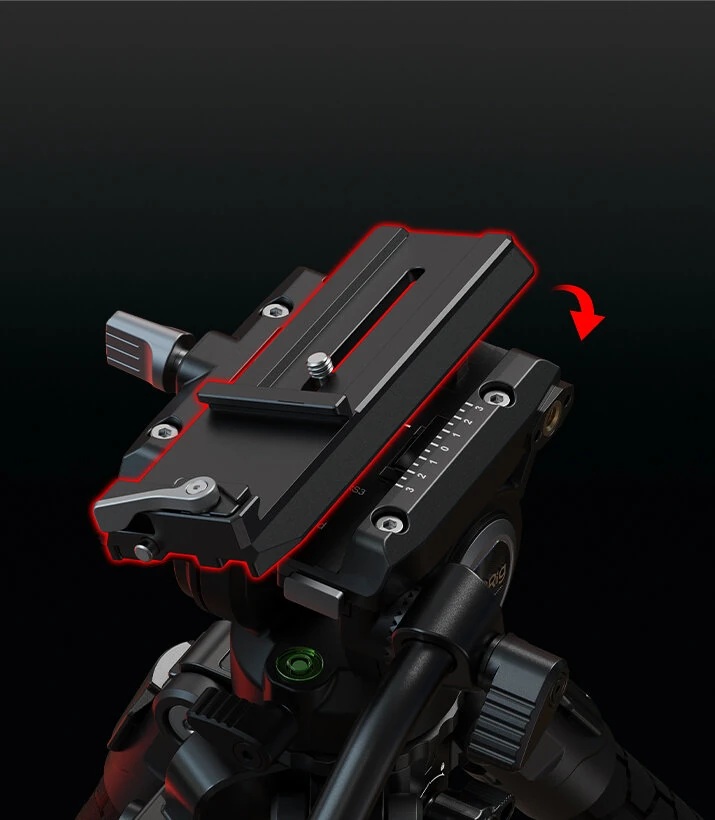 Жидкостная голова обеспечивает плавные движения: поворот на 360° и наклон от +90° до –65°. Поддерживается работа как со стандартной быстросъёмной площадкой Manfrotto 501, так и с площадками DJI RS-серии, переключение между ними осуществляется простым движением рычага. Голова оснащена бесступенчатой демпфирующей системой и фиксированным противовесом, что особенно удобно при работе с зеркальными и беззеркальными камерами.