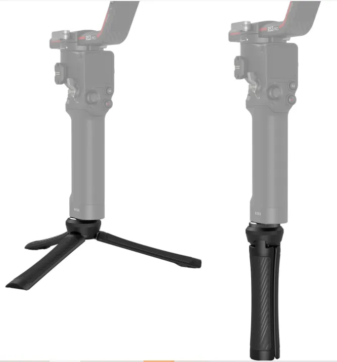 Для приведения штатива в рабочее состояние достаточно сдвинуть верхнюю часть вверх — опорные ножки автоматически зафиксируются в развёрнутом положении. Для крепления оборудования используется стандартный винт 1/4"-20 с защитной силиконовой прокладкой. Это позволяет устанавливать штатив под камеру, небольшую клетку, карданный стабилизатор или компактный осветительный прибор.