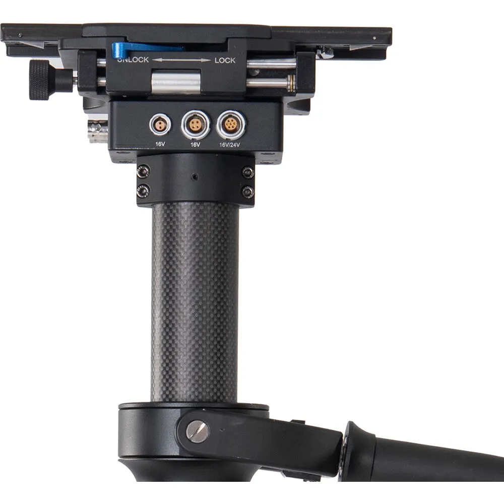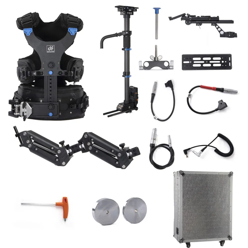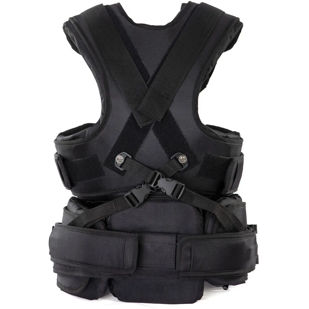 Жилет с мягкой подкладкой и двойной системой рычагов равномерно распределяет нагрузку по плечам и корпусу. Регулировка по обхвату талии до 130 см обеспечивает плотную посадку для операторов любого телосложения. Натяжение рычагов настраивается ключом под конкретный вес камеры — от лёгких конфигураций 5 кг до максимальных 35 кг. Передний штифт диаметром 16 мм надёжно фиксирует карбоновую стойку, исключая люфты даже при резких движениях.