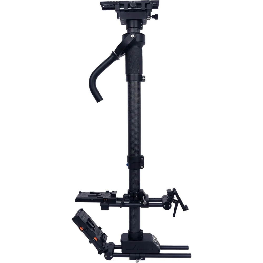 Карбоновые салазки высотой от 67 до 110 см позволяют точно настроить центр тяжести под любую конфигурацию камеры. Ручки точной регулировки на платформе обеспечивают микронастройку без инструментов. В комплекте идут противовесы 500 г и 900 г для компенсации несимметричных нагрузок — например, при установке крупного объектива или монитора. Быстросъёмная площадка позволяет за секунды перейти от ручной съёмки к работе на штативе.