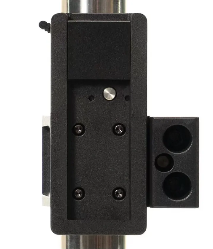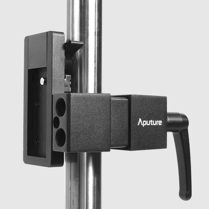 Зажим позволяет быстро устанавливать устройство на любую направляющую, квадратную или круглую трубу диаметром от 2 до 5 см. Ключевой особенностью является наличие V-образного крепления, которое может быть закреплено на зажиме Aputure для надежной фиксации аккумуляторной батареи