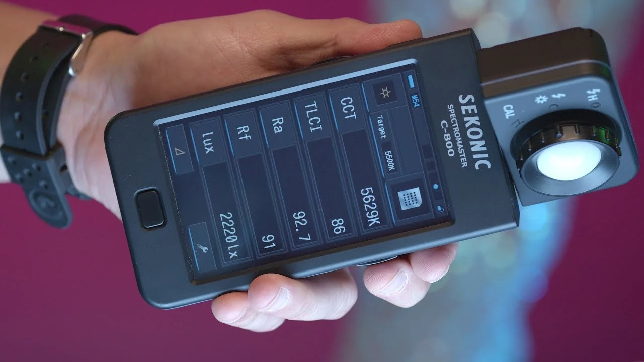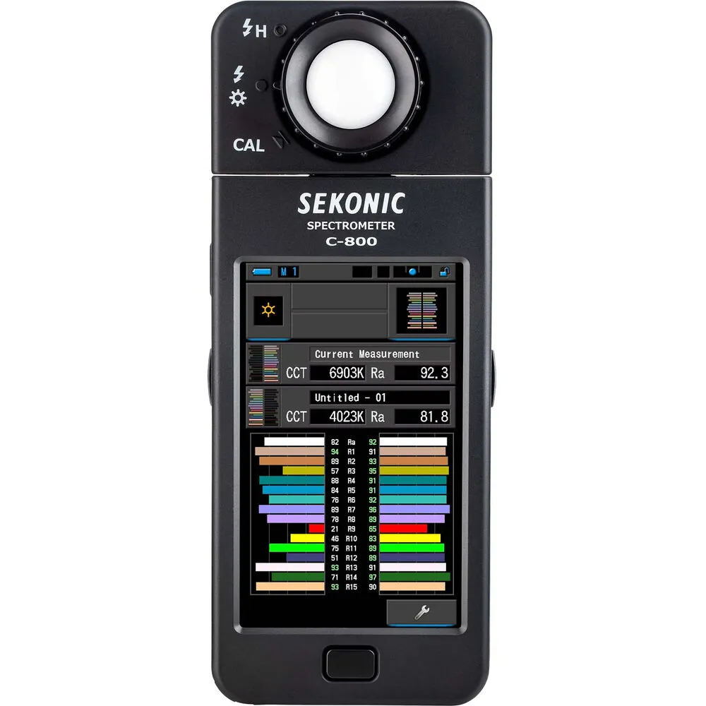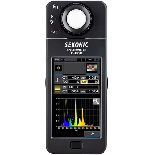 Профессиональный прибор для анализа света на съёмочной площадке, созданный для фотографов, операторов и осветителей — спектрометр Sekonic C-800 . Устройство одинаково точно работает с любыми источниками: светодиодными панелями, импульсными вспышками, галогенными лампами, люминесцентными светильниками и естественным светом. Главное преимущество индекс спектрального сходства SSI, разработанный Советом научно-технических достижений Американской киноакадемии, а также цветной сенсорный дисплей, который не просто показывает параметры, а подсказывает конкретные действия для достижения нужного результата.