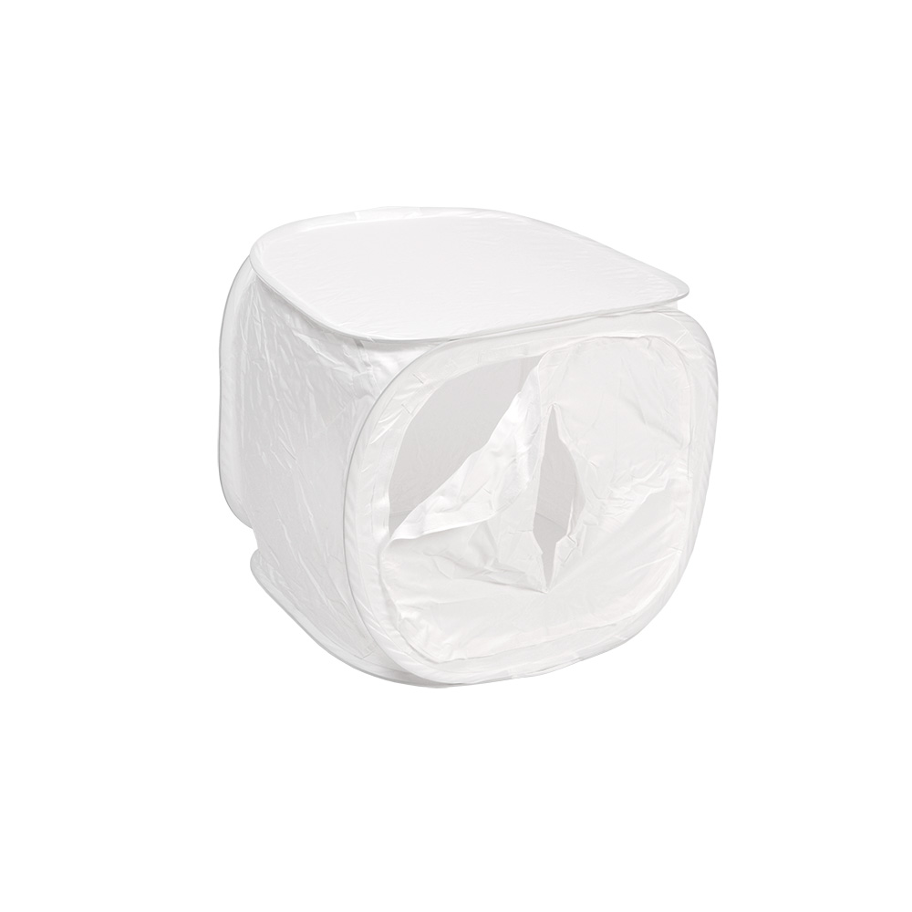Стенки фотобокса выполнены из светопропускающей синтетической ткани, каркасом являются металлические пружины. Съёмная передняя стенка фотобокса с прорезью для объектива. Фотобокс быстро разбирается и имеет небольшой вес, что делает его удобным для использования не только в студии, но и для выездных съемок. В комплекте имеется набор фонов (красный, синий, черный, белый) и чехол для транспортировки.