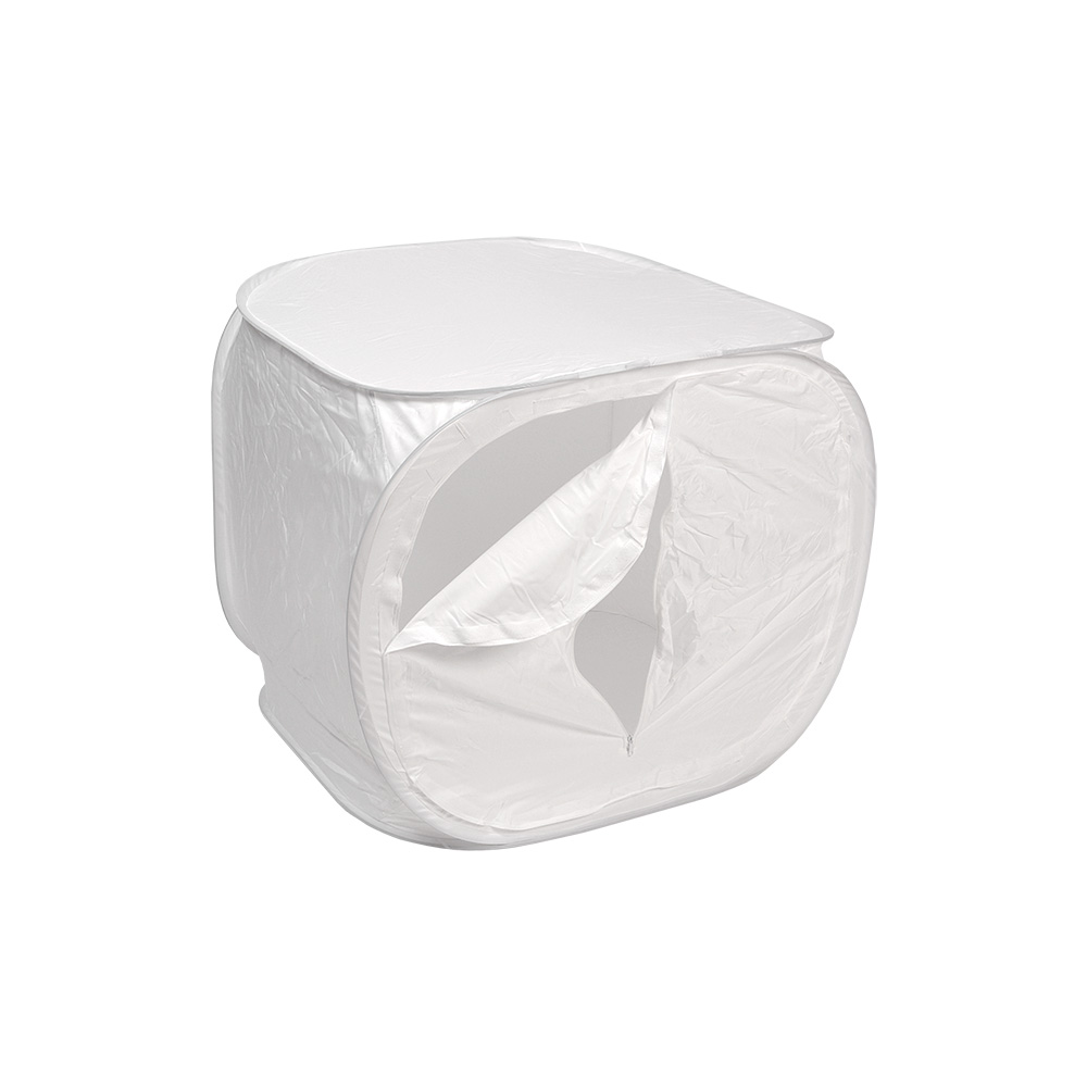 Стенки фотобокса выполнены из светопропускающей синтетической ткани, каркасом являются металлические пружины. Съёмная передняя стенка фотобокса с прорезью для объектива. Фотобокс быстро разбирается и имеет небольшой вес, что делает его удобным для использования не только в студии, но и для выездных съемок. В комплекте имеется набор фонов (красный, синий, черный, белый) и чехол для транспортировки.