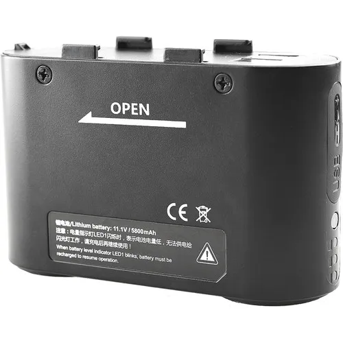 Godox BT5800 – литий-ионный аккумулятор с выходным напряжением 11,1 В и емкостью 5800 мА·ч. Используется в качестве сменного в батарейном блоке PB960, предназначенном для одновременного питания 2 накамерных вспышек Godox, Canon, Nikon, Sony, Metz, Nissin и т. д. Например, при работе со вспышкой Witstro AD360II обеспечивает 450 импульсов на полной мощности и время перезарядки 0,05–4,5 с.На корпусе находится индикатор уровня заряда аккумулятора, а также USB и одноконтактный цилиндрический DC-разъемы для зарядки. Время зарядки – около 3 ч.
