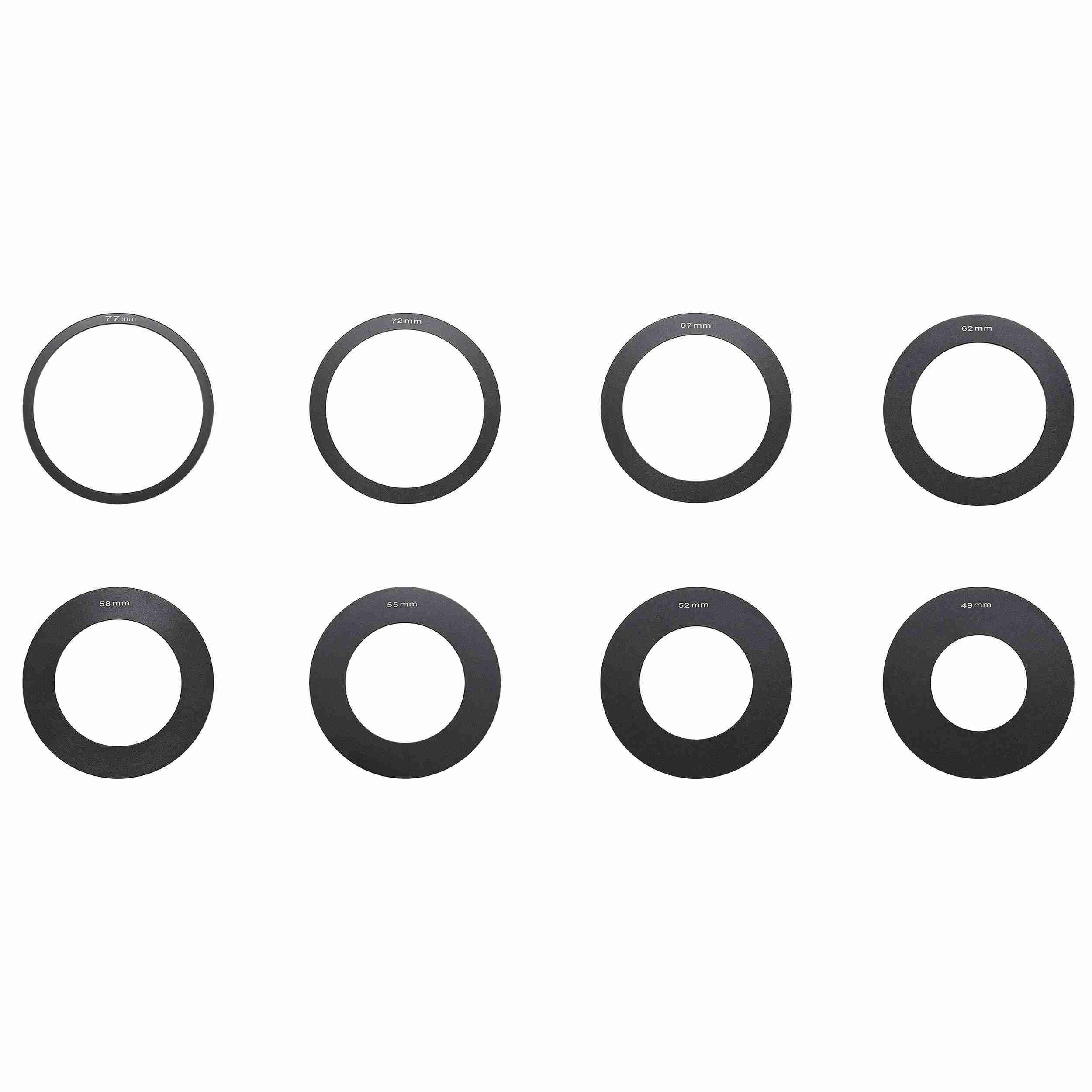 В набор входят 8 переходных колец наиболее популярных размеров (49 мм, 52 мм, 55 мм, 58 мм, 62 мм, 67 мм, 72 мм, 77 мм), которые подходят для большинства объективов различных производителей.