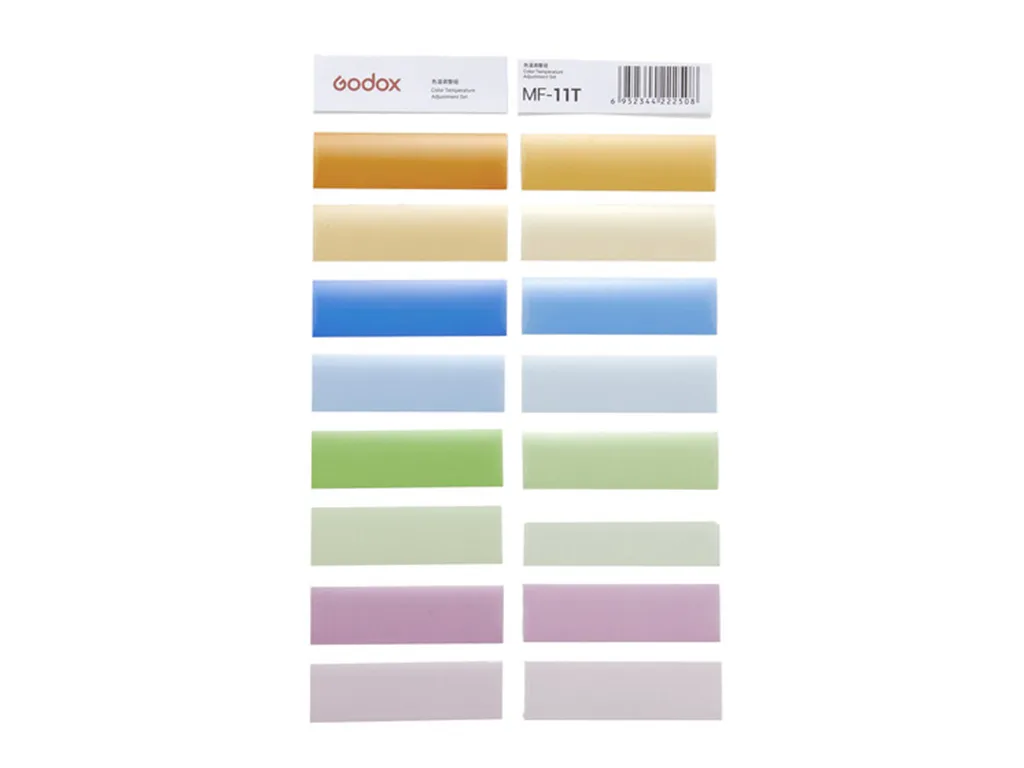MF-11T – набор цветных гелевых "фолиевых" светофильтров для коррекции цветовой температуры, изменения контрастности, яркости и цветового решения при съемке различных объектов.Включает в себя смесь гелевых фильтров.Таким образом, вы можете подбирать цветовую температуру окружающего света при каждой съемке.