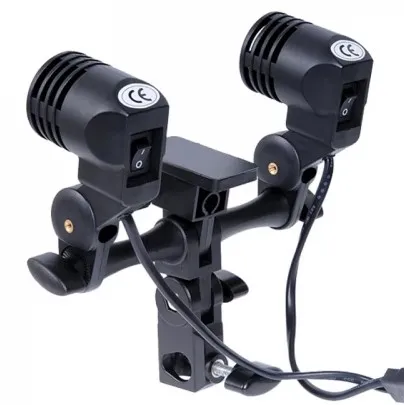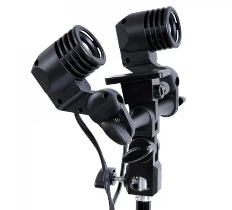 Godox LH-02 - двухламповый патрон для лампы-вспышки на поворотном кронштейне с отверстием для установки зонта. Держатель предназначен для ламп с цоколем Е27. Патроны могут поворачиваться на кронштейне вокруг оси крепления и включаться независимо друг от друга.