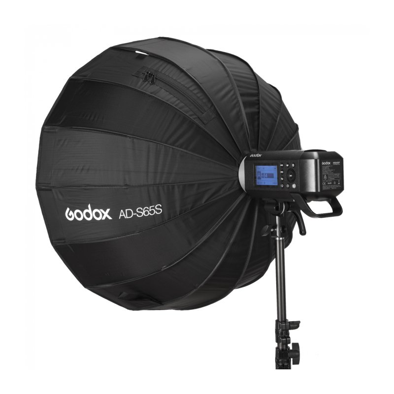 Софтбокс Godox AD-S65S быстроскладной для AD400Pro с байонетом Godox, диаметр 65 см, имеет глубокую параболическую форму, в сравнении с другими софтбоксами позволяет сформировать еще более мягкий и яркий светотеневой рисунок. Используется в рекламных съемках, видео и кинопроизводстве, портретной съемке, свадебной съемке и т.д.