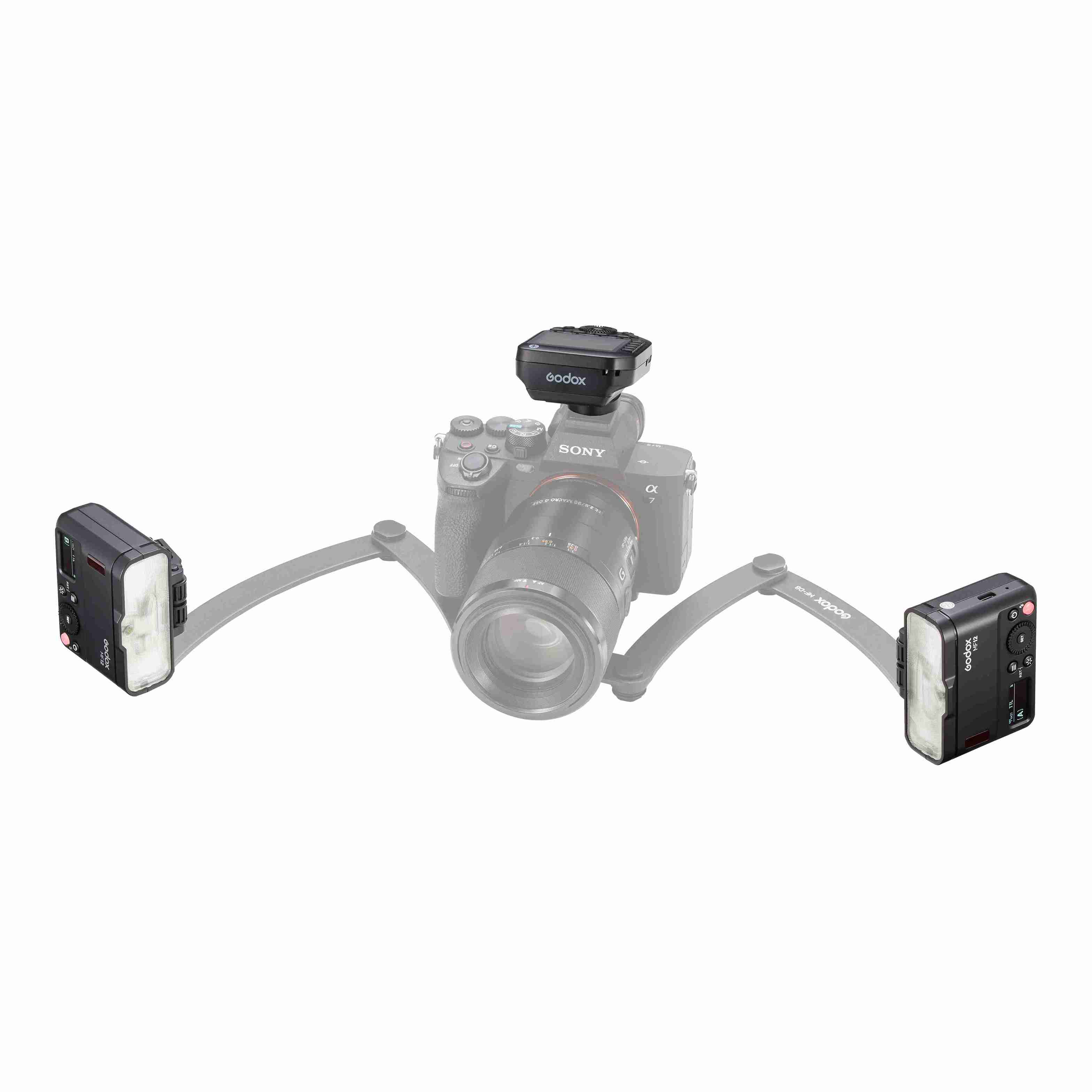 Комплект включает в себя две вспышки Godox MF12, радиосинхронизатор Godox XproII S+ для Sony, комплект переходных колец Godox AR-R Kit и монтажное кольцо Godox MF-R для установки вспышек на объектив фотоаппарата.