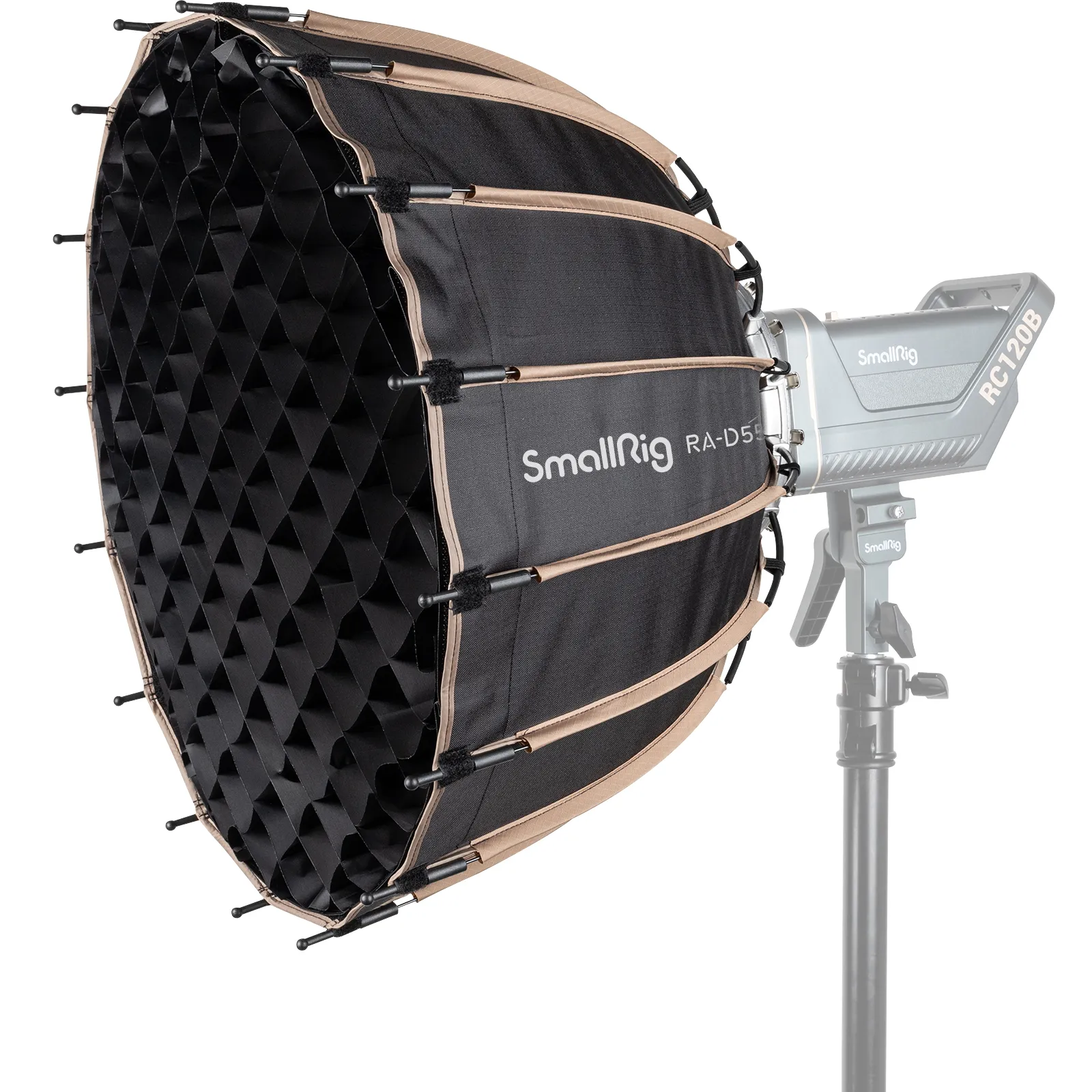 - Легкость в установке. SmallRig 3585 RA-D55 легко складывается и устанавливается на осветительный прибор при помощи крепежного кольца или сетевки, что делает его удобным в использовании на студийной съемке.