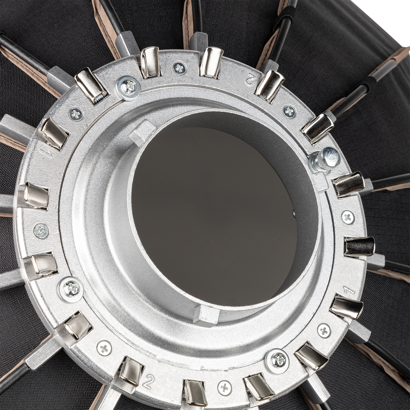 - 16-ти реберная жесткая конструкция купола софтбокса поддерживает четкую форму круга рассеивающей поверхности. Спицы легкие и жесткие, высокоэластичные, устойчивые к высоким температурам, выдерживают десятки тысяч сжатий без повреждения. Все спицы установлены снаружи для обеспечения гладкого и равномерного покрытия на внутренней поверхности.