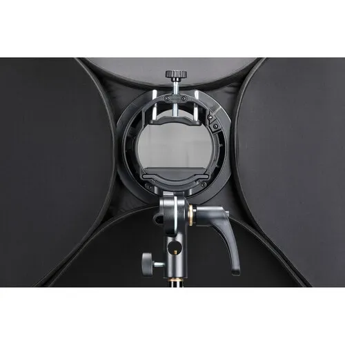 Для установки софтбокса используется байонетное крепление Bowens, что позволяет использовать широкий спектр аксессуаров, таких как портретные тарелки, стрипбоксы, октабоксы и многие другие. Софтбокс, который входит в комплект, обладает самыми оптимальными габаритами для работы с компактными вспышками. На креплении есть дополнительное отверстие для фотозонта.