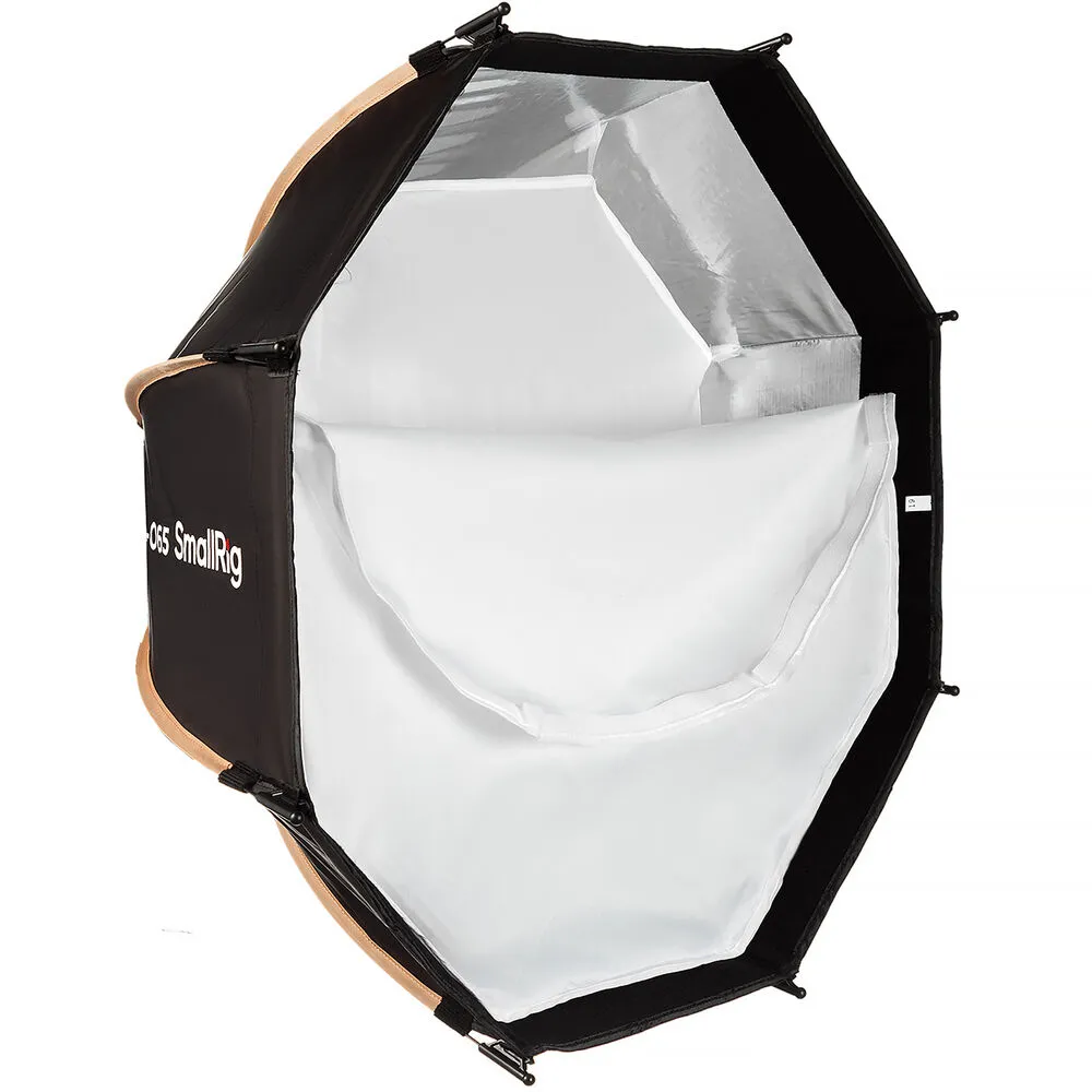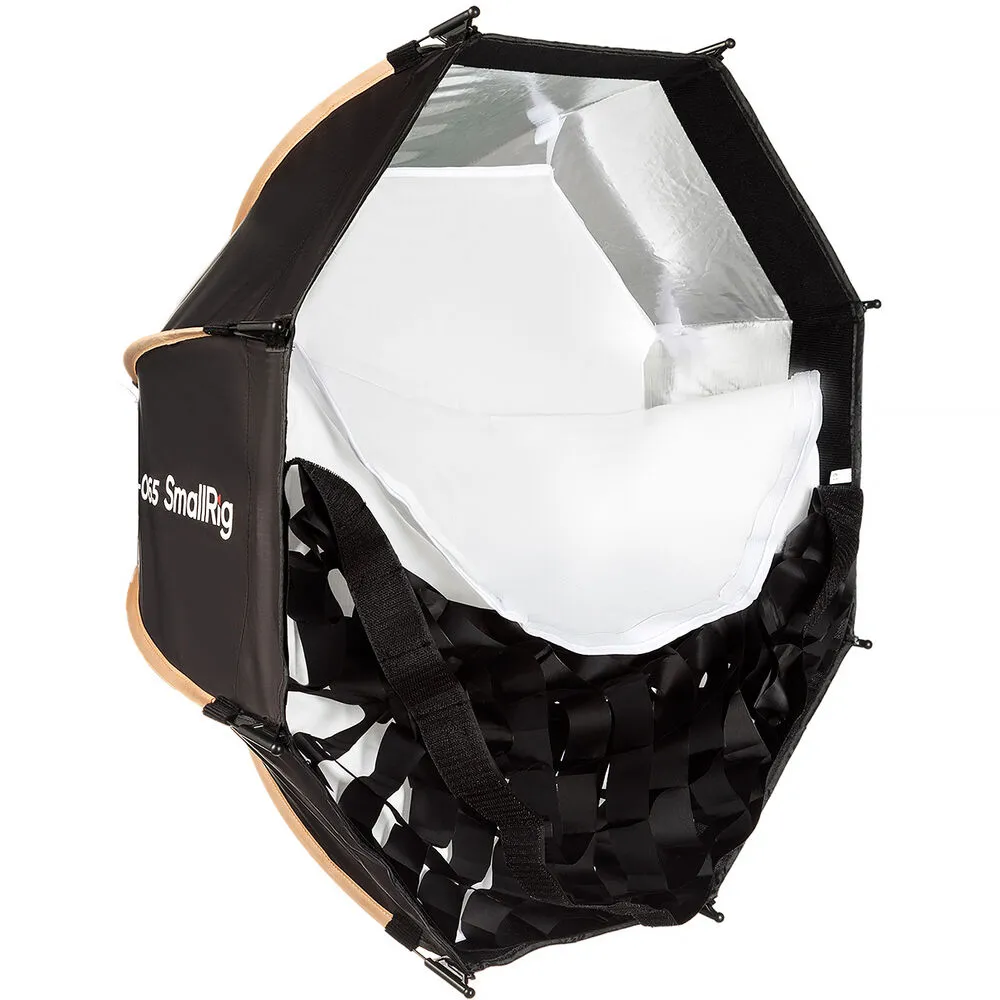 Октатбокс SmallRig LA-O65 диаметром 65 см обеспечивает мягкий и равномерный свет, создающий естественные блики в глазах объекта съёмки. Большая площадь поверхности софтбокса формирует эффект охвата, что особенно полезно при съёмке крупных планов и портретов. В комплекте идут 45° соты, которые крепятся на липучках и позволяют контролировать направление светового потока, а рассеиватели обеспечивают ещё более мягкое и рассеянное освещение.