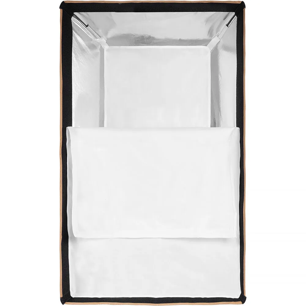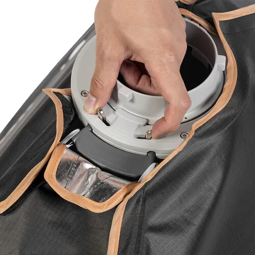 Внутренняя поверхность с высокоотражающим покрытием минимизирует потери света. В комплект входят два слоя рассеивающей ткани (внутренний и внешний), позволяющие гибко настраивать мягкость и интенсивность светового потока. Сотовая решётка с углом 90° эффективно ограничивает боковые засветки, создавая чёткий, контролируемый луч света, идеальный для портретной и предметной съёмки.