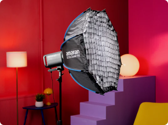 СофтбоксAmaran Octa Dome 90 — это быстрое и эффективное решение для освещения, созданное для фотографов и создателей контента, которым необходим естественный источник света с минимальным временем на установку. Его большая восьмиугольная форма максимально приближена к естественному солнечному свету, создавая мягкое, равномерно рассеянное свечение, которое улучшает оттенки кожи и текстуры, а также формирует мягкие, округлые блики в глазах.