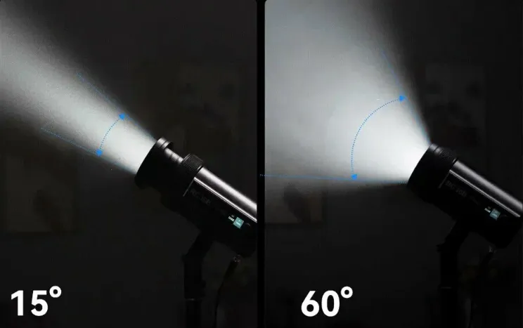 -Регулируемый угол луча от 15° до 60° позволяет точно контролировать освещение, адаптируя его под различные условия и сценарии съемки.