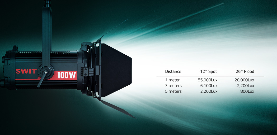 FL-C100D обеспечивает угол луча 12–26° за счет внутренней регулировки положения светодиодной платы, цифрового затемнения от 0 до 100 %.