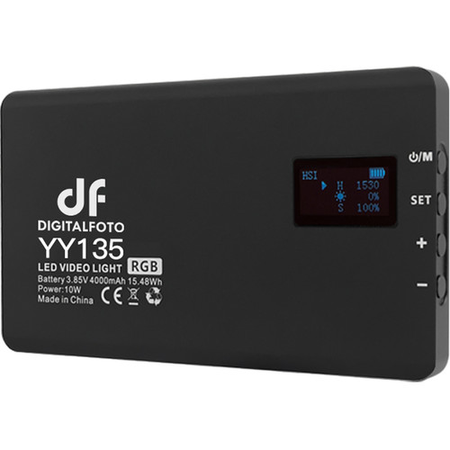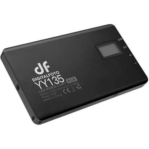 Светодиодный осветитель YY135 RGB от DigitalFoto Solution оснащен 63 RGB-светодиодами среди 135 светодиодов. YY135 с переменной цветовой температурой от 2500 до 8500 К имеет OLED-дисплей, кнопочное управление, зарядку через USB Type-C и функцию внешнего аккумулятора для подзарядки ваших мобильных устройств.