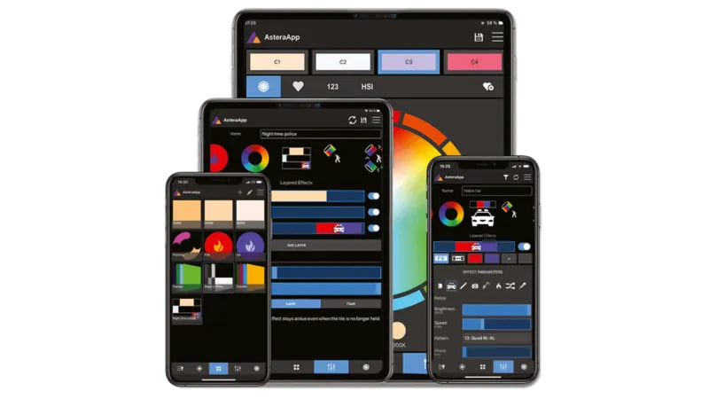 Helios позволяет использовать различные эффекты для создания креативного света, такие как молния, свеча, полицейская сирена, камин и многие другие. Для более удобного контроля над приборами от Astera и удаленного мониторинга их состояния, вы можете воспользоваться мобильным приложением AsteraApp.