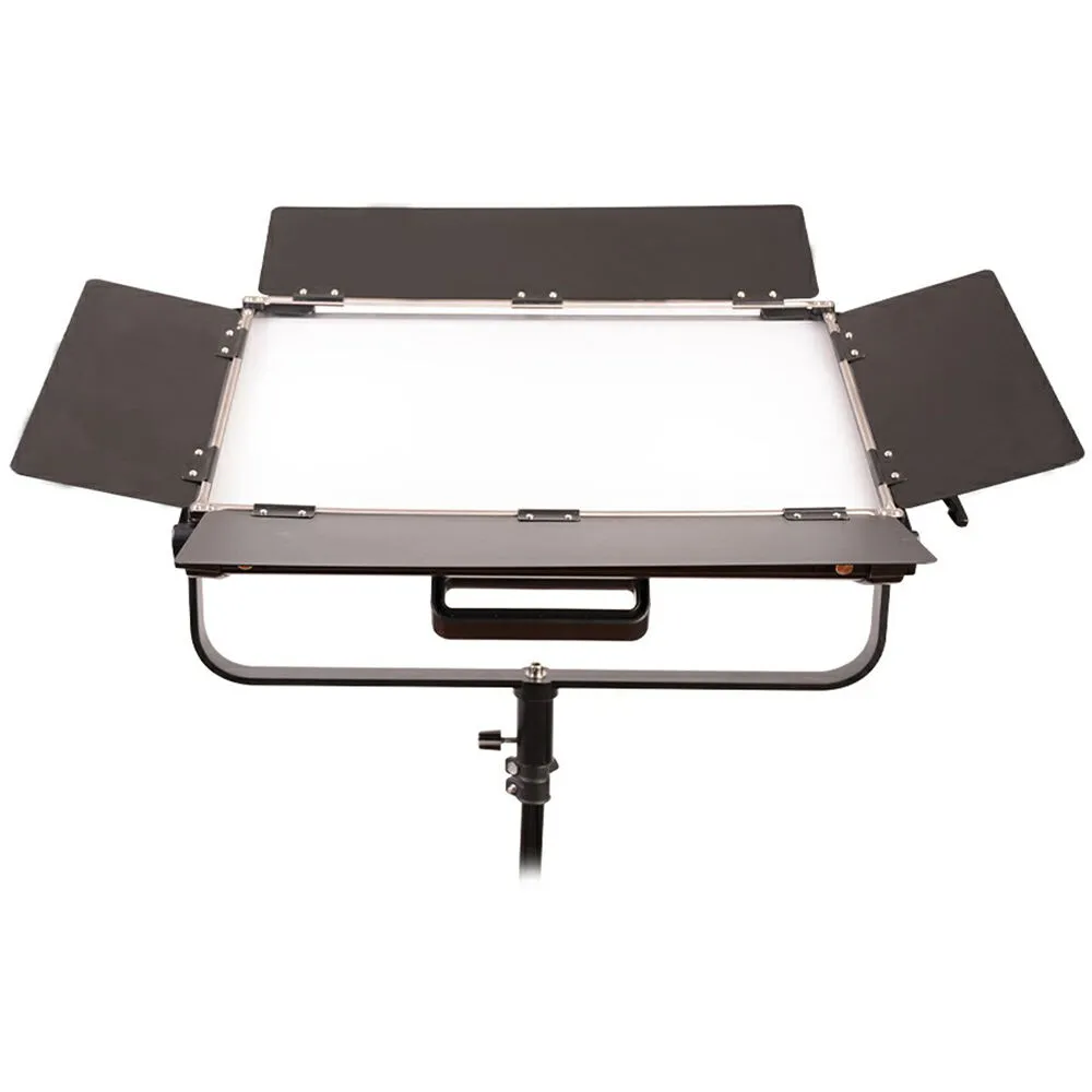 Светильник имеет широкий угол излучения 120°, который можно изменять с помощью четырехстворчатых штор, входящих в комплект. Среди преимуществ прибора — 30 специальных эффектов, а также питание от сети переменного тока или, опционально, от аккумулятора с креплением V-mount.