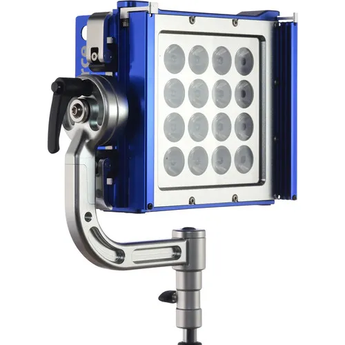 Пассивное конвекционное охлаждение работает без вентиляторов прибор не шумит, что критично при записи синхронного звука. Защита IP65 позволяет снимать под дождём и в запылённых условиях. Стандартный угол пучка 20°, в комплекте линза на 60°, другие варианты оптики доступны отдельно. Встроенный блок питания работает от сети 100–240 В по всему миру. Для съёмки в полевых условиях можно использовать аккумуляторы V-mount или Gold mount, потребуется отдельная площадка.