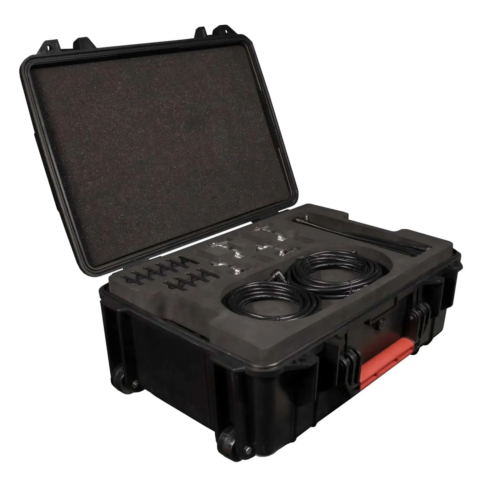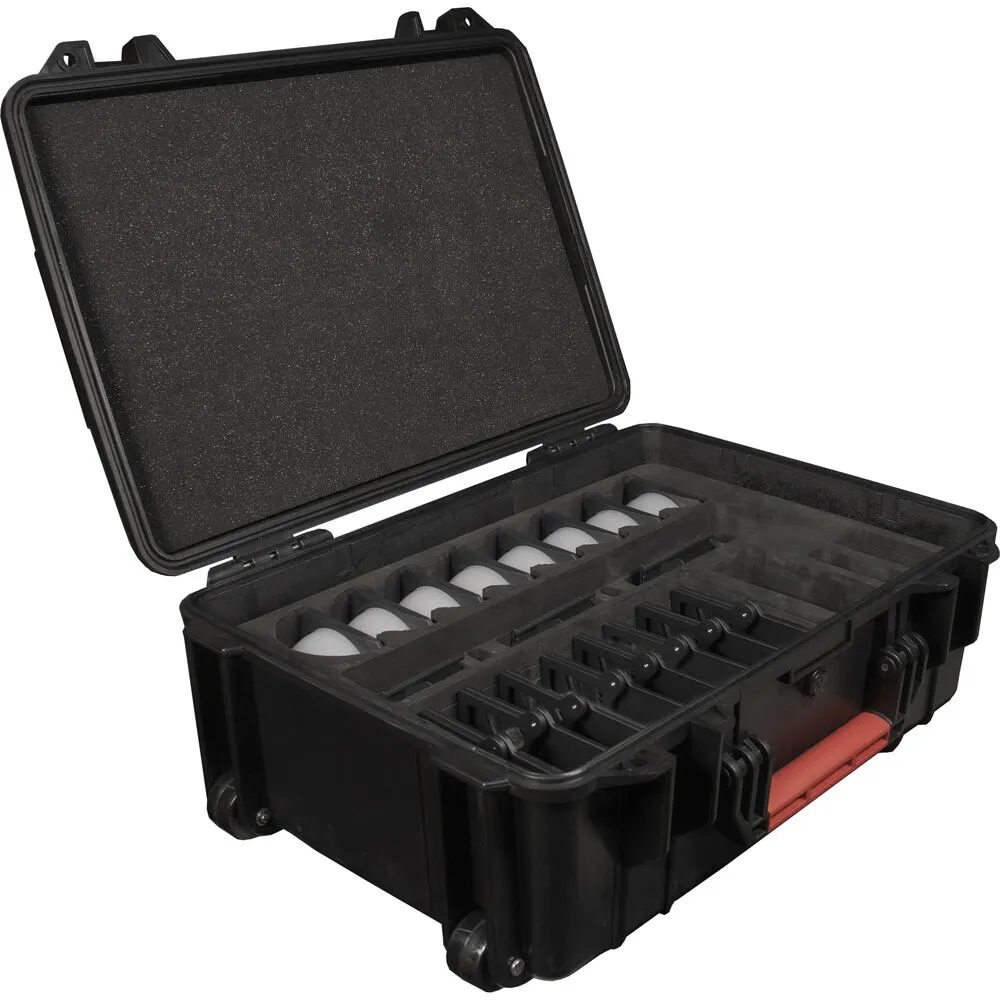 В комплект входят крепления, рассеивающие купола и кабели необходимые для профессиональной работы с приборами. Корпус кейса изготовлен из ударопрочного пластика, обеспечивающего надёжную защиту от механических повреждений и влаги. Эргономичные ручки расположены с трёх сторон для удобства переноски в любом положении, а прочные колёса с плавным ходом позволяют легко перемещать груз по различным поверхностям. Внутренние перегородки фиксируют каждый аксессуар, предотвращая смещение при транспортировке.
