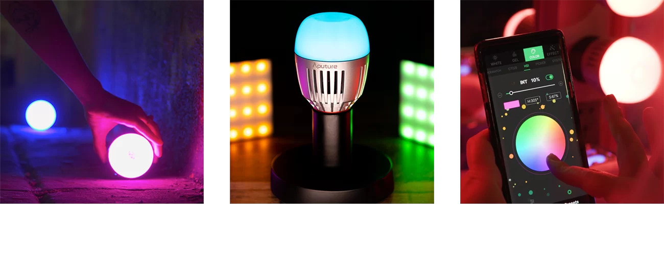 - Автономная работа: Лампы можно питать от стандартных цоколей E26/27 или использовать встроенный аккумулятор, обеспечивающий до 70 минут работы на максимальной мощности и до 20 часов на минимальной. Это отличный выбор для выездных съемок, позволяя вам легко регулировать освещение, используя приложение на вашем смартфоне.