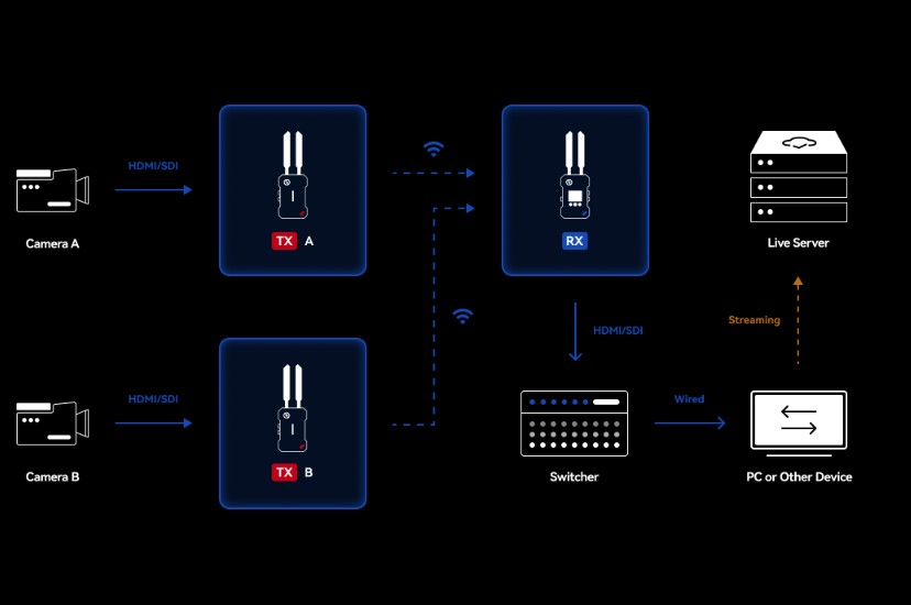 Система Hollyland Cosmo C2 обеспечивает беспроводную передачу высококачественного видео до 1080p60 на расстояние до 914 метров на один приёмник, обеспечивая гибкий мониторинг и распределение видеосигнала в студийных и полевых условиях. Комплект включает передатчик и приёмник, работающие в диапазоне 5,1–5,85 ГГц. Обновлённая версия оснащена технологией HEVO 2.0, поддержкой потоковой передачи UVC/RTMP/NDI|HX и расширенными вариантами питания.