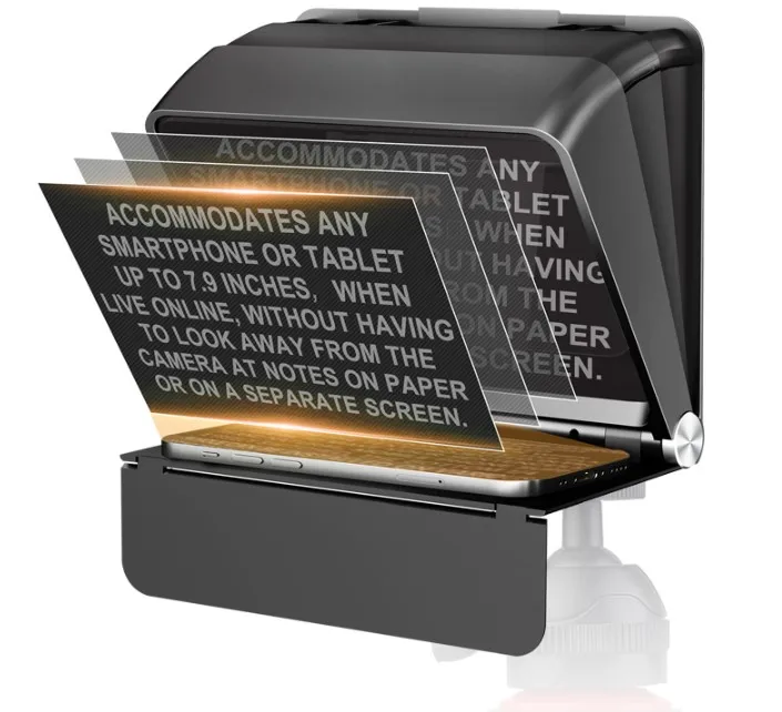 Надёжный помощник для тех, кто снимает видео с текстовой подсказкой без потери зрительного контакта с камерой. Устройство поддерживает смартфоны и планшеты до 25 см, работает в горизонтальном и вертикальном положении, а полупрозрачное зеркало 70/30 обеспечивает чёткое отображение текста без потери качества изображения. Быстрая сборка, складная конструкция и дистанционное управление делают его удобным как для студийной съёмки, так и для работы на выезде.