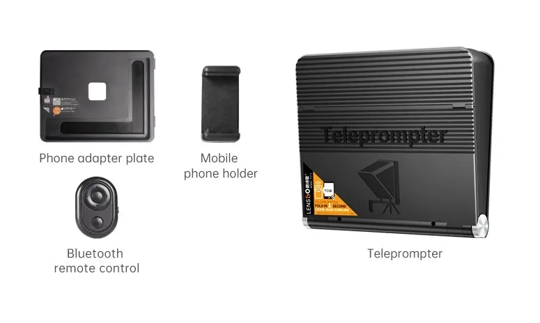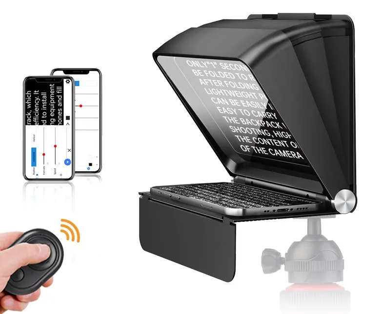 Устройство работает с любыми смартфонами и планшетами диагональю до 10 дюймов. Текст прокручивается через бесплатные приложения для iOS и Android или компактным Bluetooth-пультом из комплекта, ведущий сам контролирует скорость чтения, не отвлекаясь от камеры. Автоматическая инверсия текста в приложении упрощает настройку под зеркальное отображение.