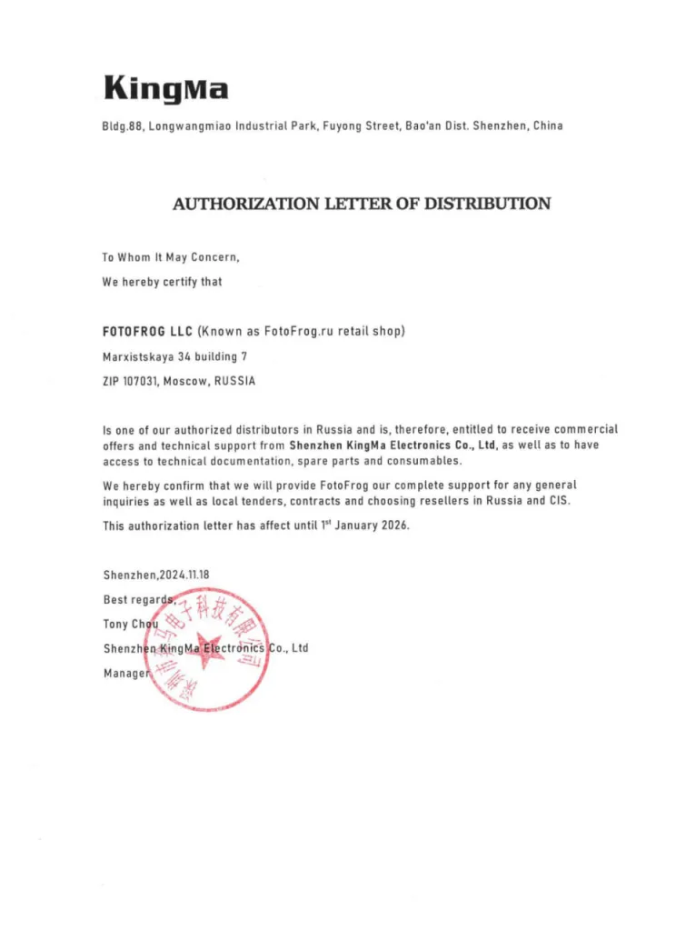 Мы в FotoFrog гордимся тем, что являемся вашим надежным поставщиком оборудования KingMa. Как авторизованный поставщик, мы предлагаем широкий ассортимент оригинальной продукции KingMa, включая зарядные устройства, аккумуляторы и аксессуары. Покупая у нас, вы не только получаете доступ к высококачественным продуктам, но и получаете выгоду от нашего исключительного обслуживания клиентов и поддержки. С FotoFrog вы можете наслаждаться беспрепятственным процессом покупки, быстрой доставкой и экспертным руководством.
